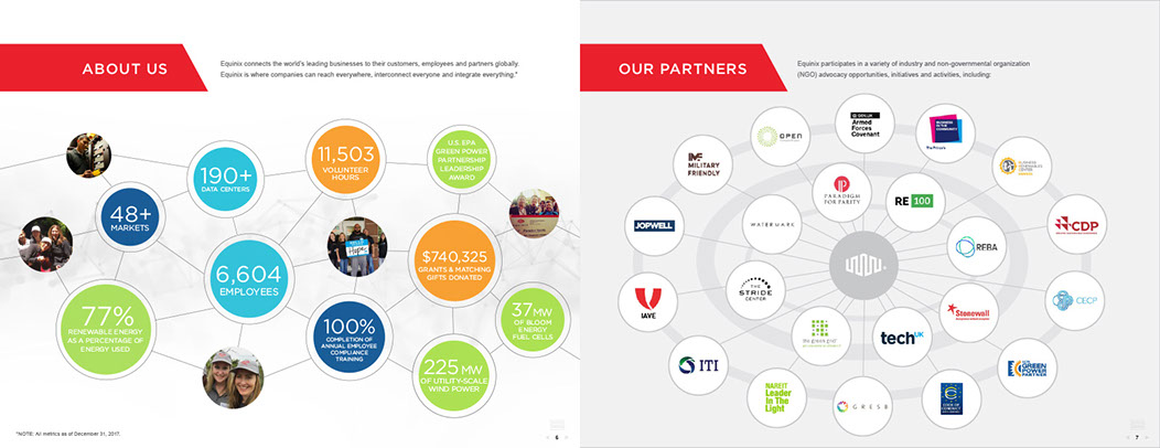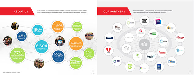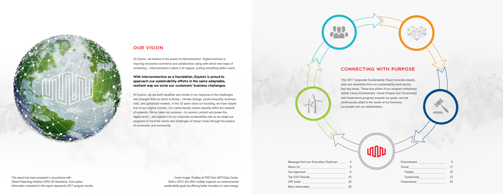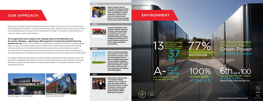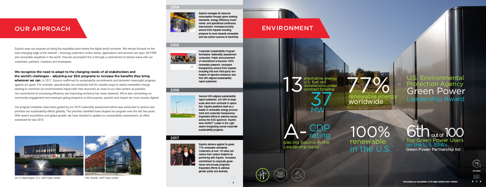 Equinix reports on the four pillars of their ESG program – Environment, People, Community and Governance. These four pillars collectively deliver robust Environment, Social and Governance (ESG) progress towards their goals.