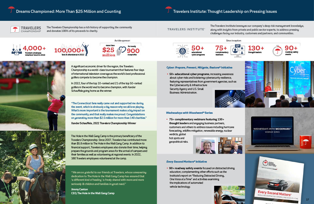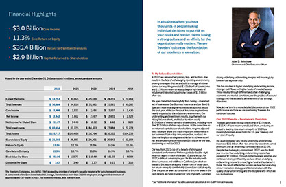 In 2022, Travelers delivered very strong results in the face of a challenging operating environment, proving once again that they are built to manage whatever comes their way. Travelers again benefited meaningfully from having a diversified set of businesses.